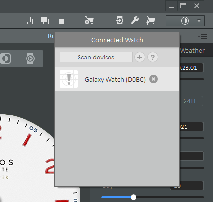 컴퓨터와 워치를 연결하기 위해 오른쪽 상단 아이콘을 클릭합니다. +버튼을 눌러 워치에 연결된 IP주소를 입력하고 OK버튼을 누릅니다. (반드시 컴퓨터와 워치의 네트워크 IP주소가 동일해야 합니다.)