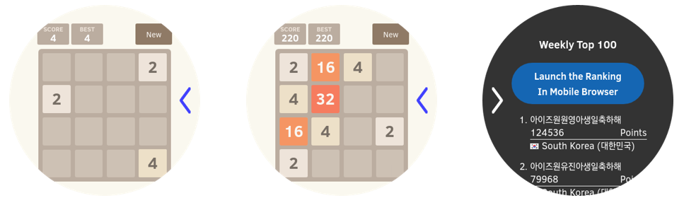 2048 게임을 워치만으로 즐길 수 있습니다. 자동 저장 기능이 있어서 게임 도중 갑작스럽게 게임을 종료하더라도 게임 진행 내용이 모두 저장됩니다. 랭킹을 제공하므로 내 실력이 얼마나 되는지 확인할 수 있습니다. 전세계 월간, 주간랭킹을 홈페이지에서 제공합니다.