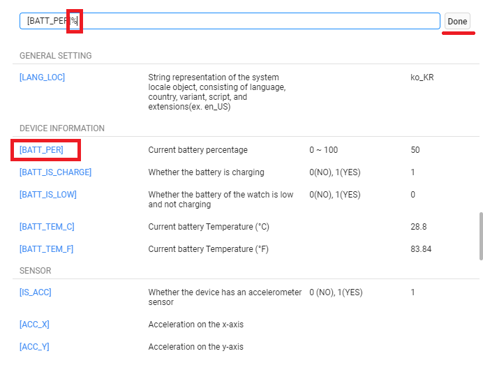 이 Tags버튼을 누르면 Text형식을 변경할 수 있는 창이 나옵니다. 쭉 내리다 보면 DEVICE INFORMATION에 [ BATT_PER ]이 있습니다. 마우스로 클릭하면 상단에 입력됩니다. 원래 입력되어있던 Text를 지우고 [ BATT_PER ] 뒤에 %를 직접 입력해줍니다.