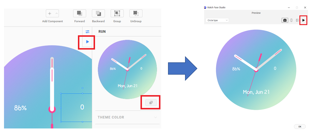 워치에서 어떻게 실행될지 확인해보려면 오른쪽 위에 있는 'Show/Hide Run'버튼을 누릅니다. 그러면 오른편에 작은 시계화면이 나오는데 그 시계화면 오른쪽 아래에 있는 버튼을 누르면 Preview 창이 나옵니다. Preview 창의 오른쪽 위에 있는 재생버튼을 누르면 일시정지 버튼으로 바뀌며 시계가 움직이는 것을 볼 수 있습니다.