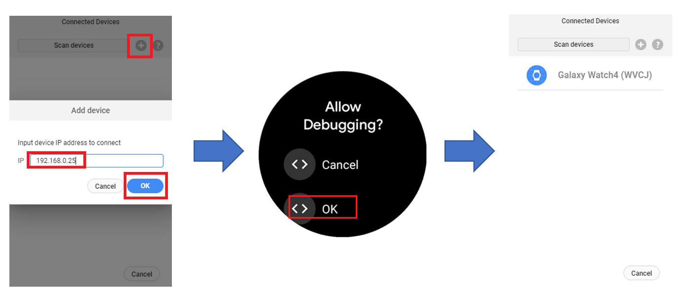 이제 다시 워치페이스 스튜디오로 돌아와서 'Run on Device'를 누릅니다. Connected Dvices 창에서 오른쪽 위에 있는 플러스 버튼을 누르고 워치에서 봤던 IP주소를 입력 후 OK를 누릅니다. 그러면 워치에 'Allow Debugging?'메시지가 뜹니다. OK를 누르면 워치가 Connected Dvices 창에 표시됩니다.