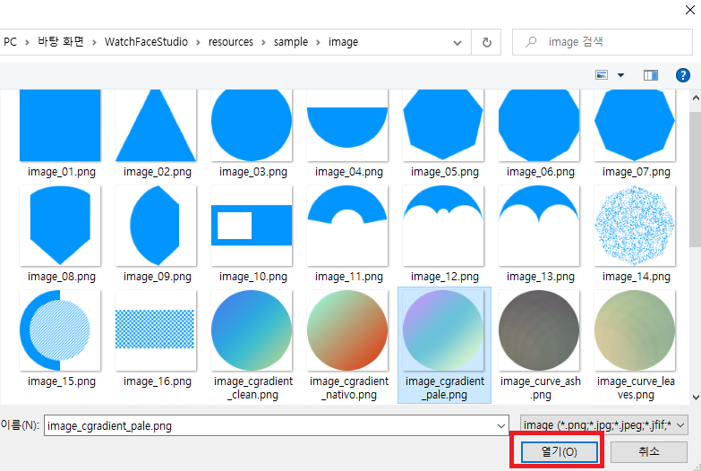 그러면 샘플 이미지가 여러 개 나옵니다. 이 중에서 원하시는 이미지를 선택하세요. 저는 image_cgadient_pale을 선택해 보았습니다. 원하시는 이미지가 없다면 이미지를 따로 만들어서 사용하셔도 됩니다. 지금은 일단 워치페이스를 직접 만들고 시계에 테스트하는 전 과정을 해보는 것이 목표이므로 기본 샘플 이미지를 선택해서 간단하게 만들어보겠습니다. 이미지선택 후 오른쪽 아래에 있는 열기를 누릅니다.