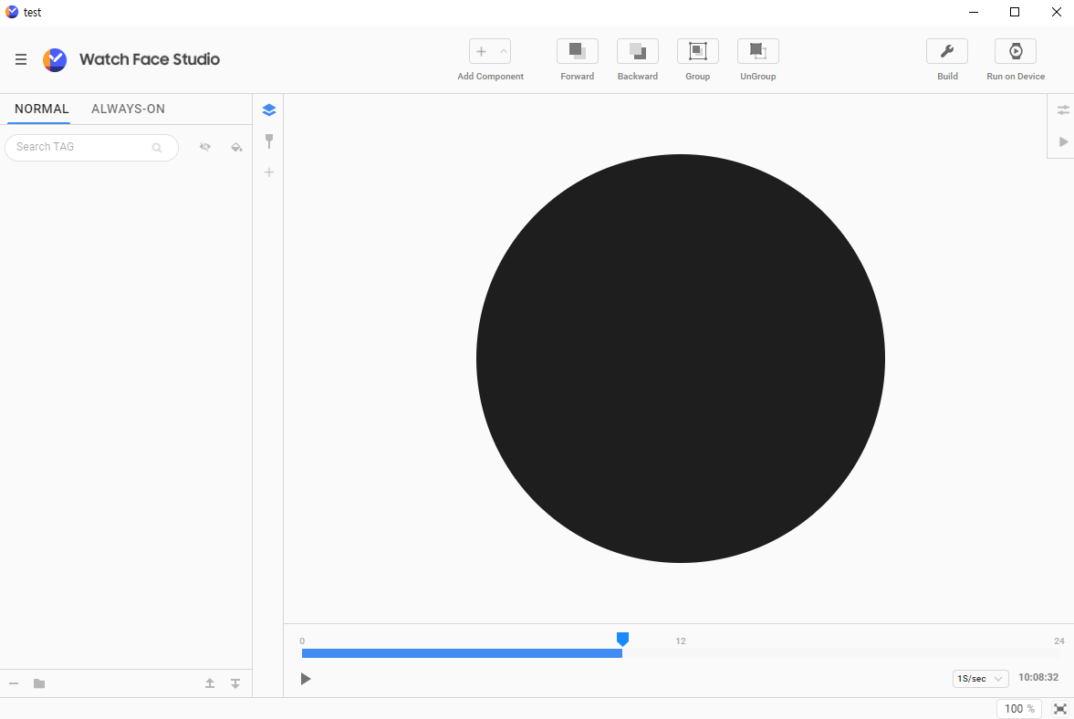 그럼 아무것도 설정되어 있지 않은 동그랗고 검정색의 워치 페이스가 나옵니다. 이제 여기에 간단하게 워치에 필요한 구성요소를 설정한 후 워치에 적용해보겠습니다.