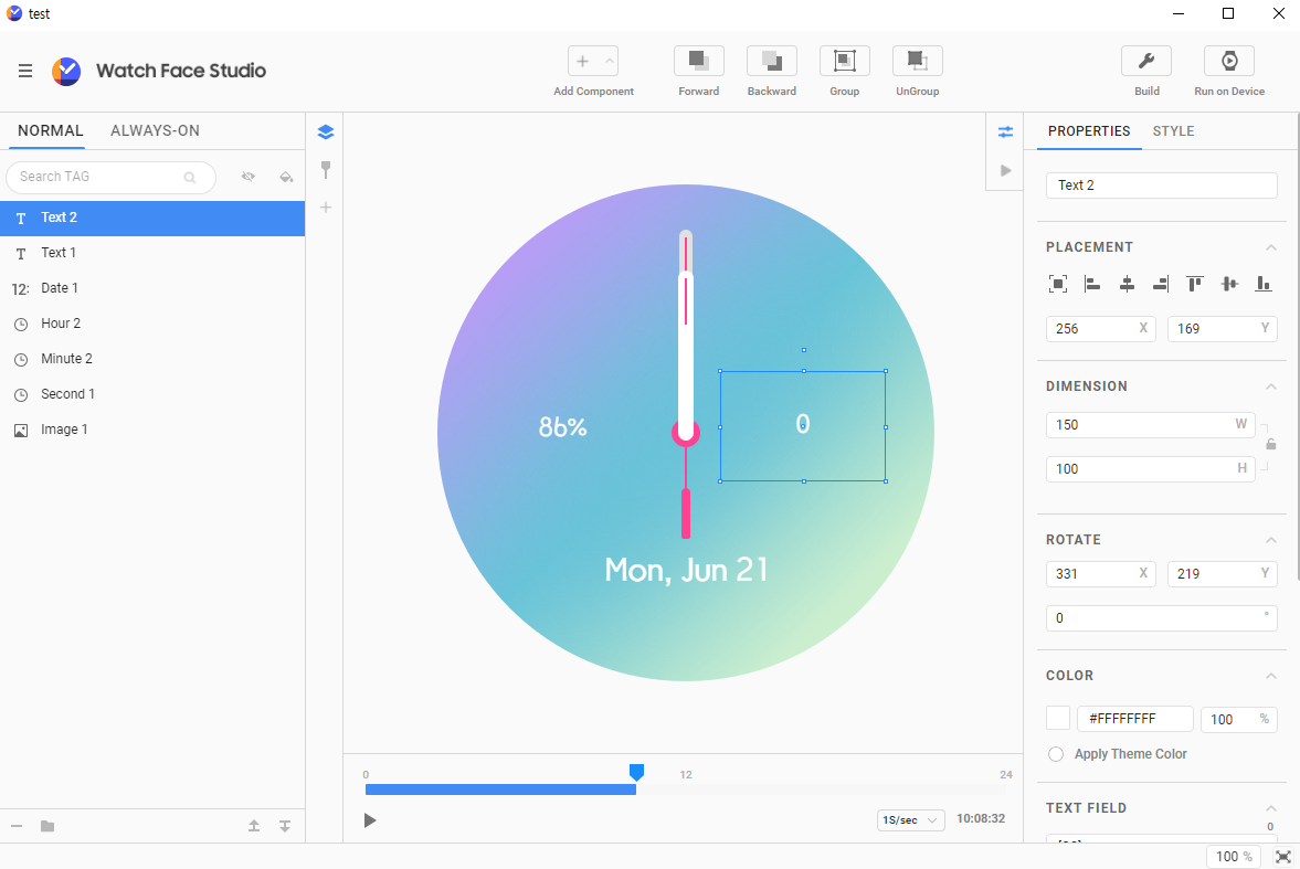 그럼 그냥 일반 Text가 가운데 생성됩니다. 이 것을 배터리나 걸음수로 바꾸기 위해서는 따로 설정이 필요합니다. 오른쪽 PROPERTIES의 TEXT FIELD의 아래 있는 Text 글씨를 클릭하면 Tags버튼이 활성화 됩니다.