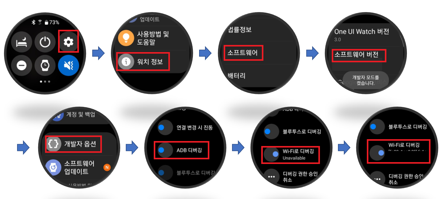 -ADB 디버깅 아래로 여러가지 디버깅이 나옵니다. 이 중에서 'Wi-Fi로 디버깅'을 누르고 화면을 껐다 켜주면 IP 주소인 192.168....:5555 숫자가 나옵니다.