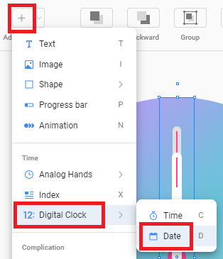 여기에 날짜와 걸음수, 배터리 잔량을 더 추가해보겠습니다. 다시 Add Component를 누르고 이번에는 Time에 있는 Digital Clock에서 Date를 선택합니다.